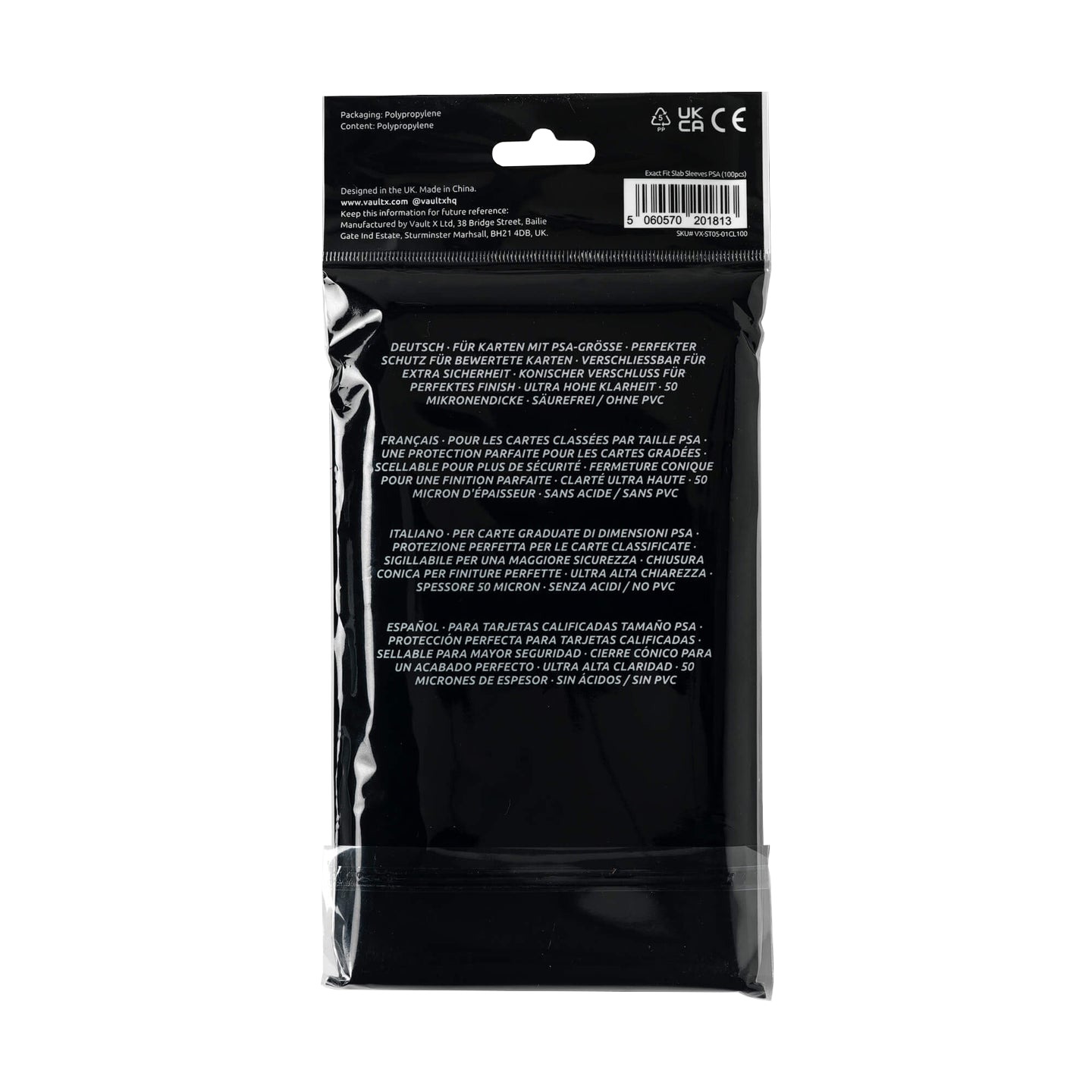 Vault X Exact Fit Slab -sleevet on valmistettu 50 mikronin paksuisesta polypropeenista. Sleeve on varustettu uudelleen suljettavalla läpällä.