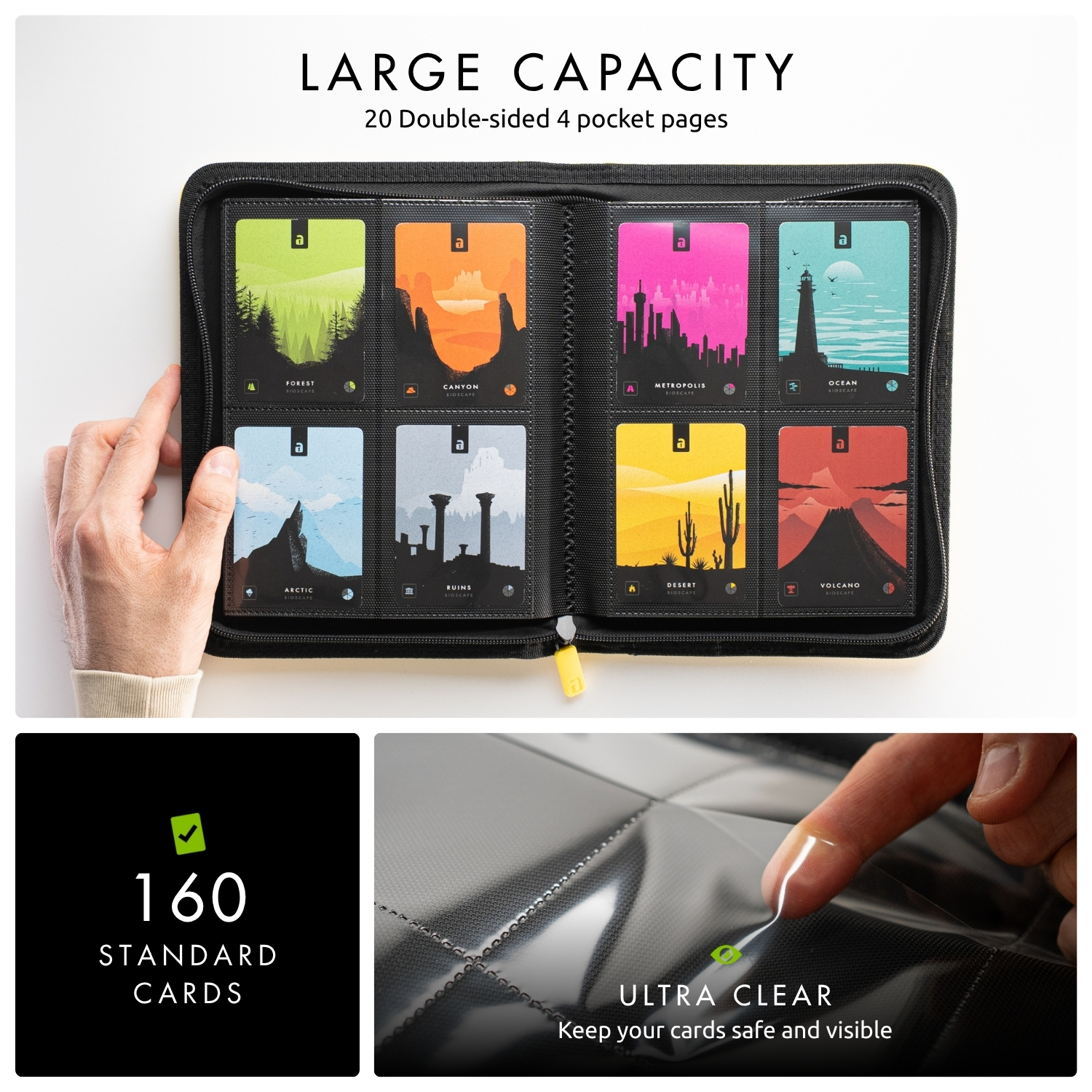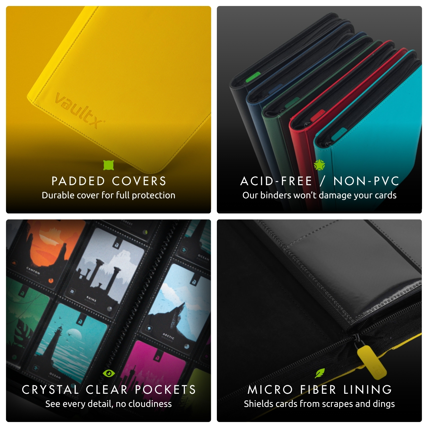 Vault X Exo-Tec Zip Binder 4-pocket (Sunrise Yellow) on vetoketjulla suljettava premium binderi. Binderissa on kaiken kaikkinaan 160 korttipaikkaa (kaksipuolisia sivuja on 20 ja jokaisella sivulla on 4 korttipaikkaa). Binderin ulkokuori on luistamatonta ja vettähylkiväa Vault X:n Exo-Tec®-materiaalia. Binderi on kokonaisuudessaan valmistettu arkistointiturvallisista, happo- ja PVC-vapaista materiaaleista.