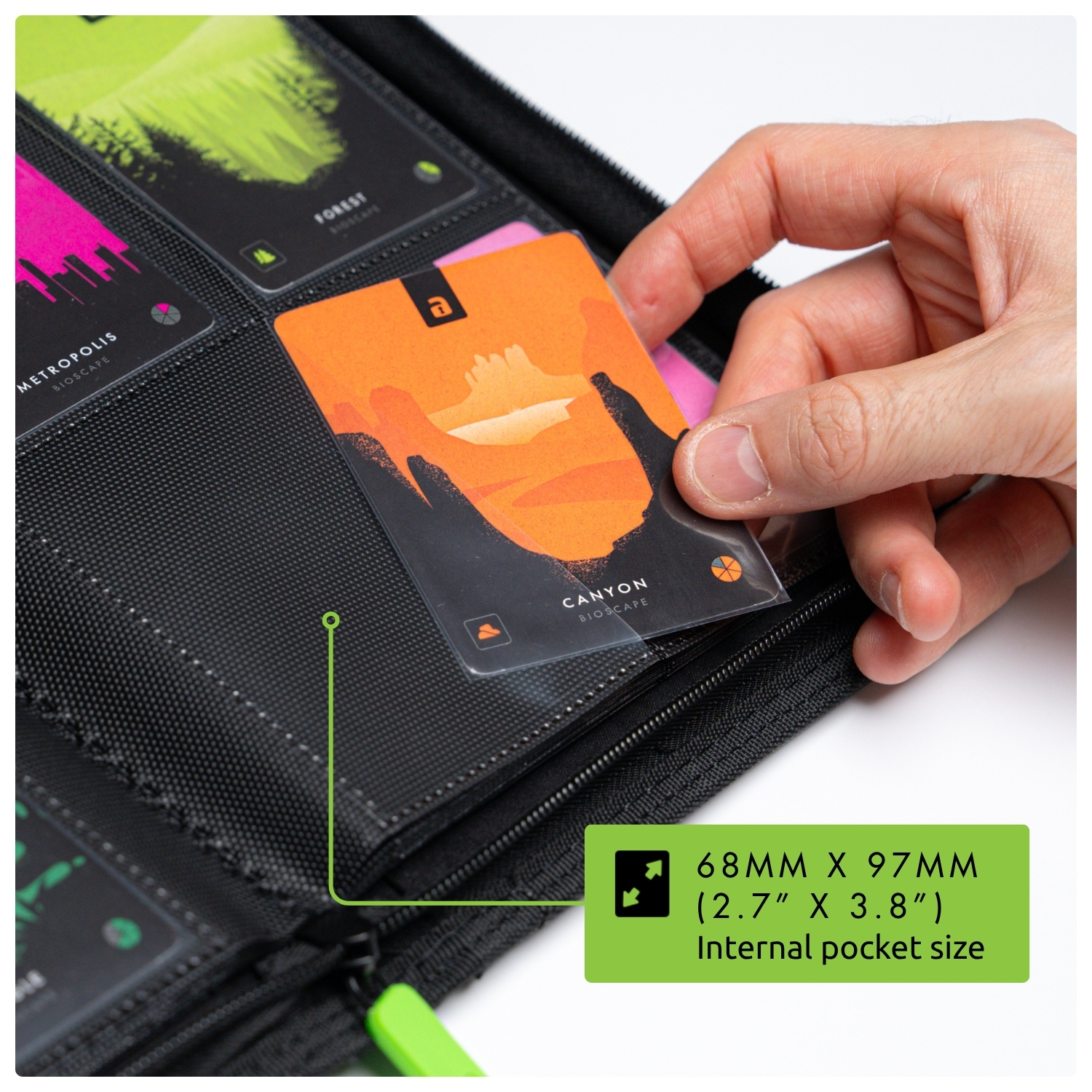 • 68 mm x 97 mm taskukoko korteille (soveltuu myös tuplasleevatuille korteille; sleevet esim. 64 x 89 mm + 66 x 91 mm)